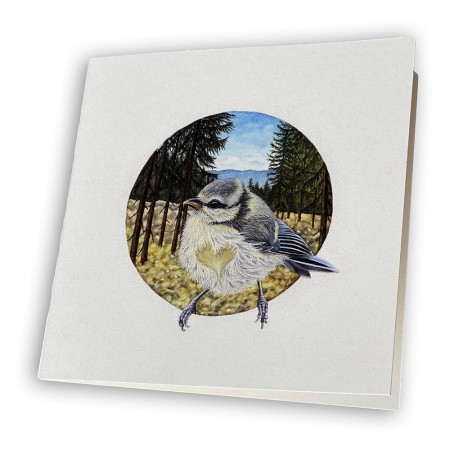 Doble kunstkort med trykk på 300 grams naturhvitt papir. Trykket lokalt hos svanemerket trykkeri. Størrelse er 15 x 15 cm (uåpnet). Hvit konvolutt er inkludert.
